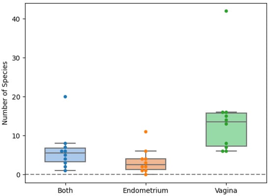 Scattered boxplot for the number of species exclusively found in the vagina, endometrium or in both locations. Orange: exclusively found in the endometrium. Green: exclusively found in the vagina. Blue: found in both vagina and endometrium.
