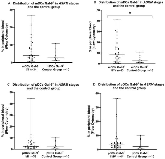 2.4. Percentage of Myeloid and Plasmacytoid Dendritic Cells with Gal-9 Expression in Relation to ASRM Stages of Endometriosis and the Control Group