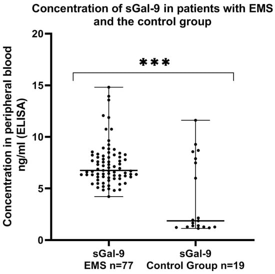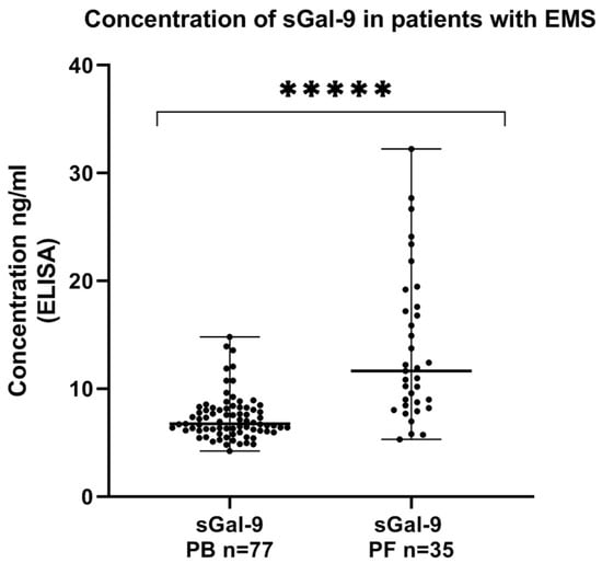 | sGal-9 (ng/mL) (n = 77) | 6.75 | 4.21–14.82 | sGal-9 (ng/mL) (n = 35) | 11.65 | 5.31–32.23 |
