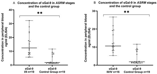 2.8. Concentration of sGal-9 in Plasma of Patients with Early (I/II) and Late (III/IV) ASRM Stages of EMS and the Control Group
