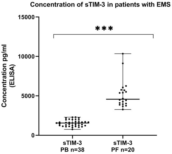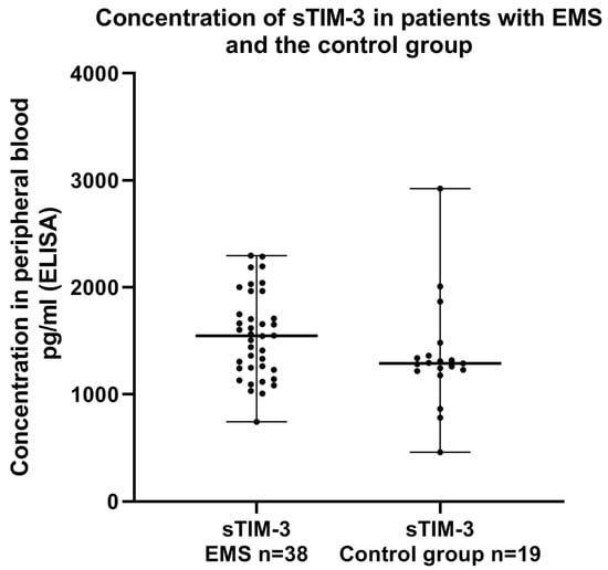 | sTIM-3 (pg/mL) (n = 38) | 1547.57 | 744.49–2297.15 | sTIM-3 (pg/mL) (n = 20) | 4569.18 | 3267.36–10,348.85 |