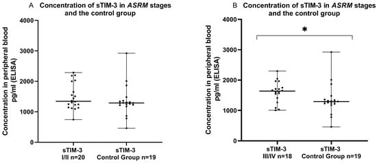 2.12. Concentration of sTIM-3 in Plasma of Patients with Early (I/II) and Late (III/IV) ASRM Stages of EMS and the Control Group