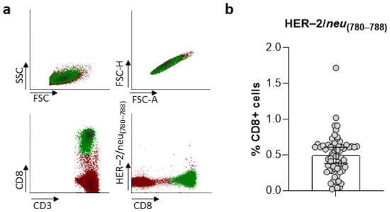 The frequencies of CD8+ T cells specific for HER-2/neu(780–788) in PCa patients’ peripheral blood were determined by multiparameter flow cytometry with the MHC peptide dextramer HLA-A*24:02-HER-2/neu(780–788). Following gating according to their FSC/SSC properties, PBMCs were subgated to CD3+ lymphocytes, which were further subgated to CD8+ T lymphocytes. HLA-A*24:02-HER-2/neu(780–788)+ lymphocytes were assessed within the gate representing CD8+ T lymphocytes after subtraction of the corresponding negative control values (Figure 1a). Following this methodology, we could detect various frequencies of CD8+ T lymphocytes specific for HER-2/neu(780–788) among our patient cohort, which ranged from 0.02–1.72% (median = 0.49%; Figure 1b).