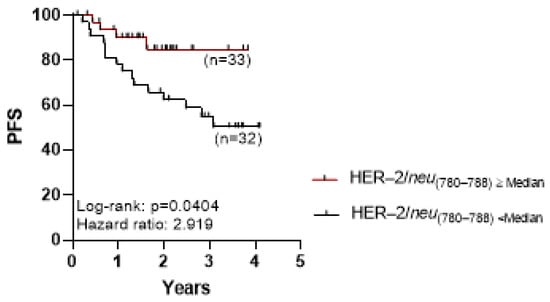 Interestingly, PCa patients with high total frequencies of the HER-2/neu(780–788)-specific CD8+ T lymphocytes (above the 0.49% median frequency value and up to 1.72%; n = 33) had significantly better clinical outcomes regarding progression-free survival (PFS), compared with those with low frequencies of such CD8+ T lymphocytes (below the median value of 0.49% and down to 0.02%; n = 32) (Figure 2; p = 0.0404). This is an important finding, given that patients belonging to these groups did not differ significantly in their clinicopathological parameters based on age, pathologic T, PSA, and Gleason score (Table 1). The levels of HER-2/neu(780–788)-specific CD8+ T lymphocytes did not differ significantly between patients on the basis of their Gleason score (≤7, n = 31 vs. >7, n = 33; p = 0.4562).