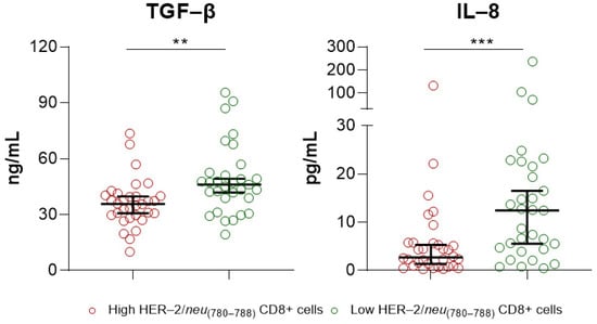 To obtain a better understanding of the differences in PFS, we analyzed the levels of IL-8 and TGF-β in the two PCa patient groups. Both of these play essential roles in the progression of PCa [,] As shown in Figure 3, the median TGF-β and IL-8 levels in patients with high frequencies of HER-2/neu(780–788)-specific CD8+ T lymphocytes were 35.73 ng/mL and 2.735 pg/mL (red circles), respectively. The median levels of both mediators were significantly higher in patients with low frequencies of HER-2/neu(780–788)-specific CD8+ T lymphocytes: 46.17 ng/mL for TGF-β and 12.44 pg/mL for IL-8 (green circles).
