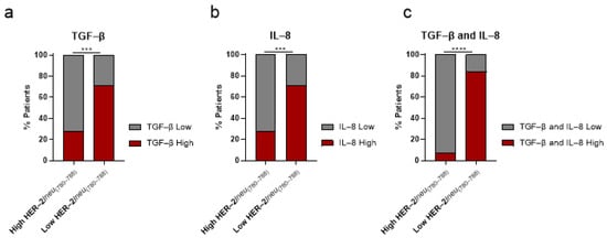 Percentages of prostate cancer (PCa) patients with high vs. low frequencies of HER-2/neu(780–788)-specific CD8+ T lymphocytes in association with high vs. low levels of (a) transforming growth factor beta (TGF-β), (b) interleukin-8 (IL-8), or (c) both. *** p < 0.001; **** p < 0.0001.