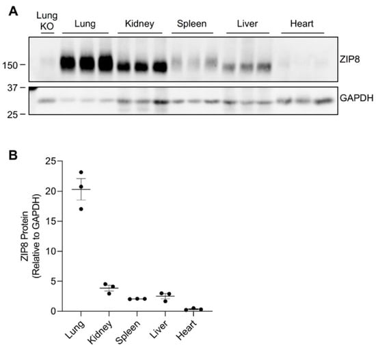 Previous human and animal studies have found that ZIP8 is ubiquitously expressed throughout the body [4,22,23,24]. Transcriptome analyses of normal mouse tissues revealed an abundant presence of ZIP8 mRNA in the lung, kidney, spleen, liver, and heart [23]. To determine the pattern of ZIP8 protein expression in these five organs, we collected tissues from age- and sex-matched mice fed a traditional rodent diet and assessed ZIP8 levels by Western blot analysis. To verify the specificity of the anti-mouse ZIP8 antibody, we used the lung tissue collected from tamoxifen-inducible Zip8-knockout (Zip8-KO) mice. We first verified that the anti-mouse ZIP8 antibody detects a ZIP8-specific band at ~150 kDa (Figure 1A and Figure S1). We then compared ZIP8 protein levels and found that ZIP8 can be detected in all five organs, with the lung exhibiting the highest and the heart exhibiting the lowest levels of ZIP8 expression (Figure 1A,B).