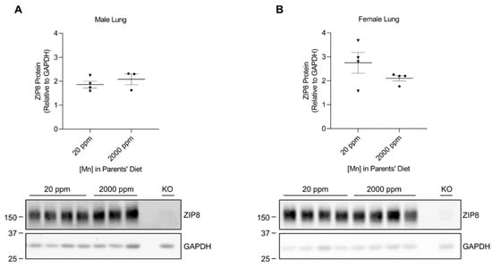 Figure 2. Comparison of ZIP8 protein expressions in the lung between the control and high-manganese diet groups. Lung samples were collected from pups at 3 weeks of age. Expression of ZIP8 in male (A) and female (B) pups that were born from and fed by mothers on 20 ppm manganese and 2000 ppm manganese diets were analyzed by Western blot analyses (n = 3–4/group). Equal amounts of protein (50 μg for male lung samples and 102 μg for female lung samples) were assessed. Blots include the lung sample from a female, 6-week-old Zip8-KO mouse (fed a traditional rodent diet) as a control to validate the anti-mouse ZIP8 antibody. Quantification of ZIP8 levels were determined using GAPDH as the loading control. Data are expressed as mean ± SEM.