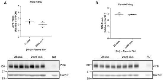 Figure 3. Comparison of ZIP8 levels in the kidney between the control and high-manganese diet groups. Kidney samples were collected from pups at 3 weeks of age for Western blot analysis. Expression of ZIP8 in male (A) and female (B) pups that were born from and fed by mothers on 20 ppm manganese and 2000 ppm manganese diets were compared (n = 3–4/group). Samples with equal amounts of protein (159 μg) were analyzed. Blots include the kidney sample from a female, 6-week-old Zip8-KO mouse (fed a traditional rodent diet) as a control. Quantification of ZIP8 levels were determined using GAPDH as the loading control. Data are expressed as mean ± SEM.