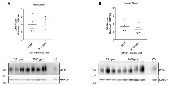 Figure 4. Comparison of spleen ZIP8 levels between the control and high-manganese diet groups. Spleen samples were collected from pups at 3 weeks of age. ZIP8 in male (A) and female (B) pups that were born from and fed by mothers on 20 ppm manganese and 2000 ppm manganese diets were analyzed by Western blot analyses (n = 3–4/group). Samples with equal amounts of protein (124 μg) were assessed. Blots include the spleen sample from a female, 6-week-old Zip8-KO mouse (fed a traditional rodent diet) as a control. Quantification of ZIP8 levels were determined using GAPDH as the loading control. Data are expressed as mean ± SEM.