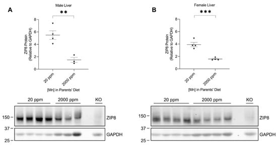 Figure 5. Comparison of liver ZIP8 levels between the control and high-manganese diet groups. Expressions of ZIP8 in male (A) and female (B) pups that were born from and fed by mothers on 20 ppm manganese and 2000 ppm manganese diets were compared (n = 3–4/group). Liver samples were collected from pups at 3 weeks of age for Western blot analysis. Equal amounts of protein (213 μg for male liver samples and 240 μg for female liver samples) were loaded per lane. Blots include the liver sample from a female, 6-week-old Zip8-KO mouse (fed a traditional rodent diet) as a control. Quantification of ZIP8 levels were determined using GAPDH as the loading control. Data are expressed as mean ± SEM. ** p < 0.01, *** p < 0.001.