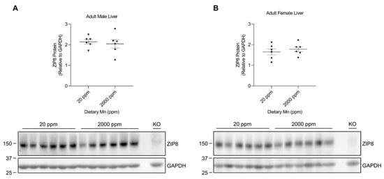 Figure 6. Comparison of liver ZIP8 levels between the control and high-manganese diet groups in adult mice. Expressions of liver ZIP8 in male (A) and female (B) mice on 20 ppm and 2000 ppm manganese diets were analyzed by Western blotting (n = 6/group). Liver samples were collected at 12 weeks of age. Equal amounts of protein (222 μg for male liver samples and 220 μg for female liver samples) were assessed. Blots include the liver sample from a female, 6-week-old Zip8-KO mouse (fed a traditional rodent diet) as a control. Quantification of ZIP8 levels were determined using GAPDH as the loading control. Data are expressed as mean ± SEM.