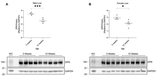 Figure 7. Comparison of liver ZIP8 protein levels between 3-week-old and 12-week-old mice. Expressions of ZIP8 in male (A) and female (B) mice at 3 weeks and 12 weeks of age were analyzed by Western blotting (n = 4–5/group). Samples with equal amounts of protein (200 μg) were assessed. Blots include the liver sample from a female, 6-week-old Zip8-KO mouse (fed a traditional rodent diet) as a control. Quantification of ZIP8 levels were determined using GAPDH as the loading control. Data are expressed as mean ± SEM. * p < 0.05, *** p < 0.001.