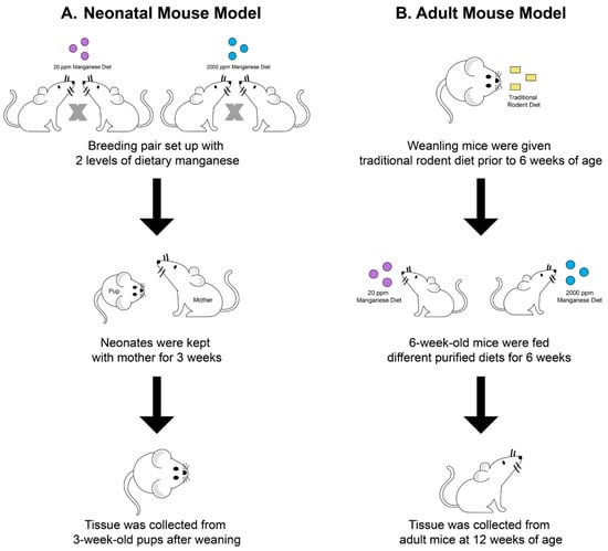 The creation of the manganese overload conditions in young mice and adult mice was described previously [31,38]. Briefly, for the neonatal manganese overload model, mating mice were fed with a modified AIN-93G diet containing 20 ppm or 2000 ppm manganese starting at 8–9 weeks of age. Mating mice consumed these diets throughout breeding and lactation periods for a total of 6–7 weeks. The progenies of the mating mice were fed a maternal milk diet from birth to 3 weeks of age. Tissues were harvested from the progenies at the weaning age of 21 days (Figure 8A). For the adult manganese overload model, weanling (21-day-old) wild-type mice were given a traditional rodent diet between 3 weeks and 6 weeks of age. Starting at 6 weeks of age, the mice transitioned to receiving a modified AIN-93G animal diet containing 20 ppm or 2000 ppm of manganese (Figure 8B). The mice were euthanized at 12 weeks of age for tissue collection.