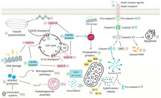 Additionally, it has been reported that the antiproliferative effects of other chalcones, such as isoliquiritigenin analog [52] and flavokawain B [53], are associated with G2/M cell cycle arrest. Furthermore, it is important to mention that several chalcones also initiate cell death via the activation of the extrinsic apoptosis pathway [54,55,56,57] or the induction of non-apoptotic cell death [53,58,59,60]. General pathways involved in the cell cycle and apoptosis are presented in Figure 2.