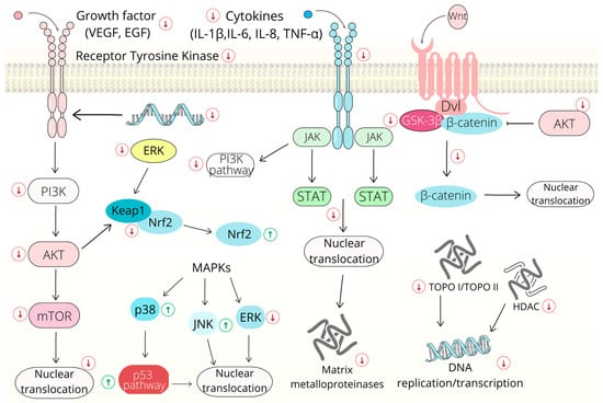 Effect of chalcones on selected signaling pathways. Mechanism of modulation of intracellular signaling pathways in gastrointestinal cancer cells. Abbreviations: AKT—protein kinase B, Dvl—disheveled, EGF—epidermal growth factor, ERK—extracellular signal-regulated kinase, GSK-3β—glycogen synthase kinase-3 beta, HDAC—histone deacetylase, IL—interleukin, JAK—Janus kinase, JNK—c-Jun N-terminal kinases, Keap1—Kelch-like ECH-associated protein 1, mTOR—mammalian target of rapamycin, Nrf2—NF-E2–related factor 2, p38—p38 mitogen-activated protein kinase, p62—sequestosome 1, PI3K—phosphoinositide 3-kinase, ROS—reactive oxygen species, STAT—signal transducer and activator of transcription, TOPO I/II—topoisomerases I/II, TNF-α—tumor necrosis factor alpha, VEGF—vascular endothelial growth factor. The original figure was made for this review using the Canva software by Radka Michalkova.