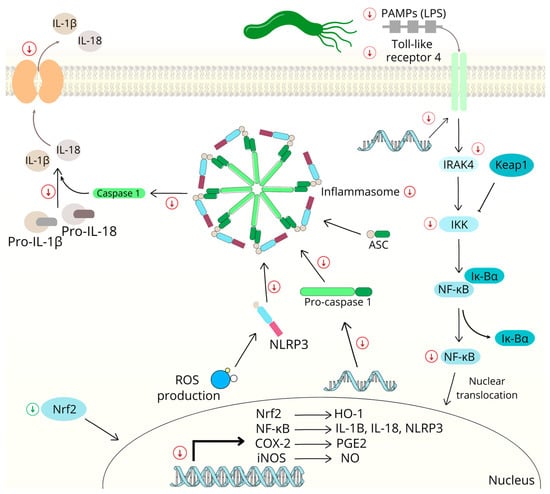 The Toll-like receptor 4 (TLR4) is abundantly expressed in intestinal epithelial cells and is thought to play a key role in intestinal innate immunity [151]. It is also involved in the pathogenesis of inflammatory bowel disease, with TLR4 activation resulting in the nuclear translocation of transcriptional NF-κB and/or the activation of MAPKs, leading to the production of pro-inflammatory cytokines and chemokines [152]. Many studies have shown that NF-κB plays a major role in the development and progression of cancer because it regulates more than 400 genes that are involved in inflammation and carcinogenesis [153]. Therefore, it is desirable to down-regulate TLR4 expression, block the activation of the NF-κB and MAPK signaling pathways, and inhibit the pro-inflammatory gene expression of COX, prostaglandin E2, inducible nitric oxide synthase (iNOS) and numerous cytokines (e.g., IL-1β, IL-6, IL-8 and TNF-α).