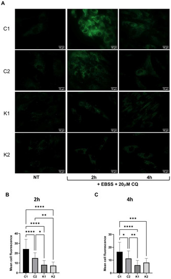 (A) Representative images of fibroblasts stained with MCD after 2 h and 4 h in EBSS plus 20 μM CQ captured through an Olympus BX-50 fluorescence microscope at 100× objective (oil immersion). (B) Mean cell fluorescence determined after 2 h in EBSS plus 20 μM CQ and (C) after 4 h. Fluorescence was measured in all cells present in six different fields. Statistical significance was calculated by one-way ANOVA and Tukey’s multiple comparisons tests *: p < 0.05; **: p < 0.01; ***: p < 0.001; ****: p < 0.0001. C1: Control 1 fibroblasts; C2: Control 2 fibroblasts; K1: Krabbe 1 fibroblasts; K2: Krabbe 2 fibroblasts.