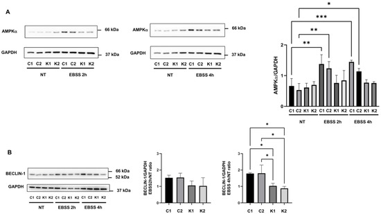 Representative Western blotting images and densitometric analysis of (A) AMPKα and (B) beclin-1 in growth conditions (NT) and after incubation with EBSS for 2 h and 4 h. Beclin-1 densitometric values are expressed as the ratio between EBSS 2 h or 4 h and growth conditions. Data are the mean ± SD of independent experiments (n = 3). GAPDH was employed as a loading control. Statistical significance was calculated by one-way ANOVA and Tukey’s multiple comparisons tests *: p < 0.05; **: p < 0.01; ***: p < 0.001. C1: Control 1 fibroblasts; C2: Control 2 fibroblasts; K1: Krabbe 1 fibroblasts; K2: Krabbe 2 fibroblasts. NT: non-treated.