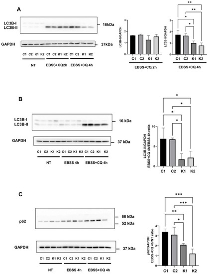 The decrease in the autophagic flux in KD fibroblasts was also corroborated by analysing p62/SQSTM1 levels during autophagy in presence of CQ compared to non-treated conditions. p62 /SQSTM1 is an ubiquitin-binding scaffold protein involved in ubiquitin-proteasome and autophagy degradation processes and it is used as an autophagic marker [21,28]. As shown in Figure 3C, the ratio between p62 levels in EBSS and in presence of CQ for 4 h and growth conditions was significantly higher in normal fibroblasts than in KD fibroblasts. Thus, in KD fibroblasts, there was a minor accumulation of p62/SQSTM1 in presence of the inhibitor of autophagosome degradation. Surprisingly, we did not observe a decrease in p62 (p62/SQSTM1) levels in cells cultivated in EBSS without CQ for 4 h (Figure 3C).