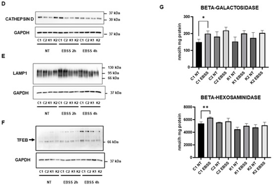 To investigate if lysosomes showed some dysfunctions during starvation-induced autophagy, we stained them using the LysoTracker probe. After 4 h of culture in EBSS, we did not detect any differences in the mean cell fluorescence among the four types of fibroblasts (Figure 4A–C). Examining cells at a higher magnification, we could better appreciate that LysoTracker staining evidenced dot structures in control fibroblasts after EBSS treatment; on the other hand, in KD fibroblasts, fluorescence appeared to be more diffused and possibly related to the phenotype of dilated lysosomes (Figure 4B). We did not detect a specific increase in cathepsin D, LAMP1 and TFEB expression in all fibroblasts during starvation (Figure 4D–F). To better investigate lysosomal functionality, we determined beta-galactosidase and beta-hexosaminidase enzymatic activities before and after 4 h in EBSS. We did not identify any changes except for the increase in both enzymatic activities in Control 1 cells after starvation. Despite that, this evidence was not confirmed in Control 2 cells (Figure 4G). Thus, based on our data, we were not able to identify specific alterations in lysosomal behaviour during autophagy induction in KD fibroblasts.