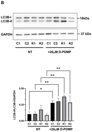 We further treated control and KD fibroblasts with d-threo-1-phenyl-2-decanoylamino-3-morpholino-1-propanol (D-PDMP) for 24 h. D-PDMP is an inhibitor of glucosylceramide synthetase and thus, it blocks glycosphingolipid synthesis. Additionally, it was demonstrated that D-PDMP is able to induce autophagy by increasing Cer levels [29] and by inhibiting mTORC1 [30]. This treatment induced LC3BII formation in control and KD fibroblasts at similar levels (Figure 5B), suggesting that the inhibition of glycosphingolipid synthesis and mTORC1 could be efficacious in stimulating autophagy in KD fibroblasts.