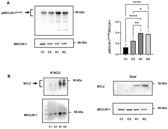 The formation of the BCL2-beclin-1 complex is another pathway that regulates autophagy [34,35]. Since we noticed an increased expression of BCL2 in KD fibroblasts in a previous study [12], we investigated if beclin-1 was more bound with BCL2 in KD than in control fibroblasts and then less available for autophagy. To this purpose, we performed immunoprecipitation experiments in growth conditions using a BCL2 antibody. Immunoprecipitated protein complexes, analysed by Western blotting and by using antibodies against BCL2 and beclin-1, revealed a higher level of beclin-1 bound to BCL2 in KD fibroblasts than in control fibroblasts (Figure 6B). Specifically, we found that the 48%, 58%, 86%, and 84.4% of beclin-1 was bound to BCL2 in C1, C2, K1, and K2 fibroblasts, respectively (calculated as bound beclin-1/bound beclin-1 + unbound beclin-1).