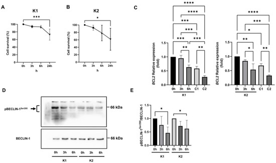 (A) Krabbe 1 (K1) and (B) Krabbe 2 (K2) cell survival upon 20 µM LY294002 treatment. Viable cells were stained with calcein AM. Significance was calculated using the ordinary one-way ANOVA test followed by Dunnett’s multiple comparisons test. N = 4 (for Krabbe 1 cells); n = 5 (for Krabbe 2 cells); ***: p < 0.001; *: p < 0.05. (C) BCL2 mRNA expression assessed by Real-Time PCR in Krabbe 1 (K1) and Krabbe 2 (K2) cells treated for 0 h, 3 h, and 6 h with 20 µM LY294002 and in Control 1 (C1) and Control 2 (C2) cells. Significance was calculated using the ordinary one-way ANOVA test followed by Tukey’s multiple comparisons test. N = 3; *: p < 0.05. **: p < 0.01; ***: p < 0.001; ****: p < 0.0001. (D) Representative Western blot images and (E) densitometric analysis of p(Ser295) beclin-1 normalized on beclin-1 expression in Krabbe 1 (K1) and Krabbe 2 (K2) fibroblasts treated for 0 h, 3 h, and 6 h with 20 µM LY294002. Significance was calculated using the ordinary one-way ANOVA test followed by Dunnett’s multiple comparisons test. N = 4; *: p < 0.05.