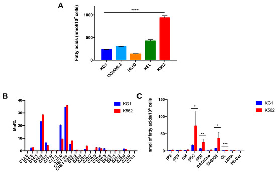 Characterization of the lipid profiles of the leukemic cell lines at basal state. (A) Total fatty acid quantification in the five leukemic cell lines. (B) Composition of total fatty acids in KG1 and K562 cells. (C) Lipid species quantification in KG1 and K562 cells. * p < 0.05, ** p < 0.01, *** p < 0.001, **** p < 0.0001. Abbreviations: (P)I: phosphatidyl-inositol, (P)S: phosphatidyl-serine, SM: sphingomyelin, (P)C: phosphatidyl-choline, (P)E: phosphatidyl-ethanolamine, DAG: diacylglycerol, Cho: cholesterol, TAG: triacylglycerol, CE: cholesteryl-ester, CL: cardiolipin, LBPA: lyso-biphosphatidic acid, Cer: ceramide.