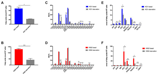 Impact of the nutrient depletion on the two cell lines KG1 and K562. (A,B) Total fatty acid amount in KG1 and K562, respectively, at basal state versus in starvation. (C,D) Composition of total fatty acids in KG1 and K562, respectively, at basal state versus in starvation. (E,F) Lipid species quantification in KG1 and K562, respectively, at basal state versus in starvation. * p < 0.05, ** p < 0.01, *** p < 0.001.