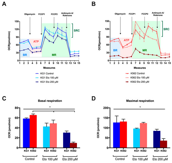 Variation in the respiratory profiles of the two cell lines KG1 and K562 at 24 h of culture. The profiles of the key parameters of KG1 (A) and K562 (B) in their basal state, and with increasing concentrations of etomoxir (100 and 200 µM) are presented, as are the OCR variations in basal respiration (C) and maximal respiration (D). * p < 0.05. Abbreviations: ATP: adenosine triphosphate, BR: basal respiration, FCCP: carbonyl cyanide p-trifluoro-methoxyphenyl hydrazone, MR: maximal respiration, OCR: oxygen consumption rate, SRC: spare respiratory capacity.
