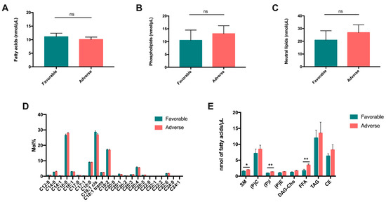 Variation in fatty acid content and lipid species in AML patients according to their prognosis. The amounts of total fatty acids (A), phospholipids (B) and neutral lipids (C) were quantified in patients with favorable and adverse prognoses. (D) Composition of total fatty acids in plasma of patients with favorable and adverse prognoses. (E) Lipid species quantification in plasma of patients with favorable (n = 5) versus adverse (n = 5) prognoses. ns: non-significant, * p < 0.05, ** p < 0.01.