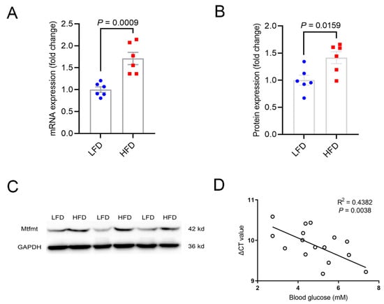 We compared Mtfmt expression in the livers of mice fed an LFD with the expression levels of mice fed an HFD to investigate the correlation between Mtfmt and metabolic states. The abundances of Mtfmt mRNA and proteins were significantly higher in high-fat-diet (HFD, 60% fat)-fed compared with low-fat-diet (LFD, 10% fat)-fed mice (Figure 1A–C). Further, the expression of Mtfmt in the liver was negatively correlated with fasting glucose levels (Figure 1D).