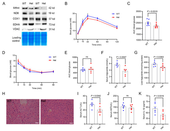 Mtfmt haploinsufficiency improved hepatic metabolic health. (A) The expression of Mtfmt, ND6, COX1, SDHA, and VDAC in the liver mitochondria of WT and Het male mice. (B) Blood glucose levels as assayed by GTT of 23-week-old Het and WT male mice, * p < 0.05 (WT versus Het). (C) Area under the curve (AUC) statistics for GTT, n = 7. (D) Blood glucose levels as assayed by ITT of 23-week-old Het and WT male mice. (E) AUC statistics for ITT, n = 7, ns indicates no significance. (F) Blood triglyceride concentrations in 23-week-old Het and WT male mice. (G) Liver triglyceride concentrations in 23-week-old Het and WT male mice. (H) Representative images of H&E-stained sections of livers from 23-week-old Het and WT male mice (scale bar, 20 μm). (I,J) Blood ALT (I) and AST (J) concentrations in 23-week-old Het and WT male mice, ns indicates no significance. (K) Blood IL-1β concentrations in 23-week-old Het and WT male mice.