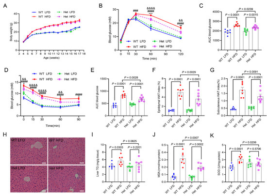 The WT and Het KO male mice were normally housed in standard cages with free access to food and water under a 12 h dark–light cycle for 28 weeks. The 4-week-old littermates of the WT and Het KO male mice were randomly assigned to feed on either the low-fat diet (LFD, 10% kcal fat; XTCON50J, Jiangsu Xietong Pharmaceutical Bio-engineering Co., Ltd., Nanjing, China) or the high-fat diet (HFD, 60% kcal fat; XTHF60, Jiangsu Xietong Pharmaceutical Bio-engineering Co., Ltd., Nanjing, China) for 17 weeks. The Nanjing Agricultural University Institutional Animal Care and Use Committee (IACUC) approved all experimental protocols, and all procedures followed the “Guidelines on Ethical Treatment of Experimental Animals.” (2006) No. 398 set by the Ministry of Science and Technology, China, and the “Regulation regarding the Management and Treatment of Experimental Animals” (2008) No. 45 set by the Jiangsu Provincial People’s Government.