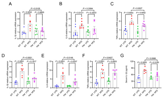 Mtfmt haploinsufficiency alleviates HFD-induced inflammation. (A–C) The relative expression levels of IL-1β (A), IL-6 (B), and TNFα (C) mRNA in the livers of WT LFD, WT HFD, Het LFD, and Het HFD mice. (D–F) The relative expression levels of IL-1β (D), IL-6 (E), and TNFα (F) mRNA in the epididymal fat of WT LFD, WT HFD, Het LFD, and Het HFD mice. (G) Blood IL-1β concentrations in WT LFD, WT HFD, Het LFD, and Het HFD mice.