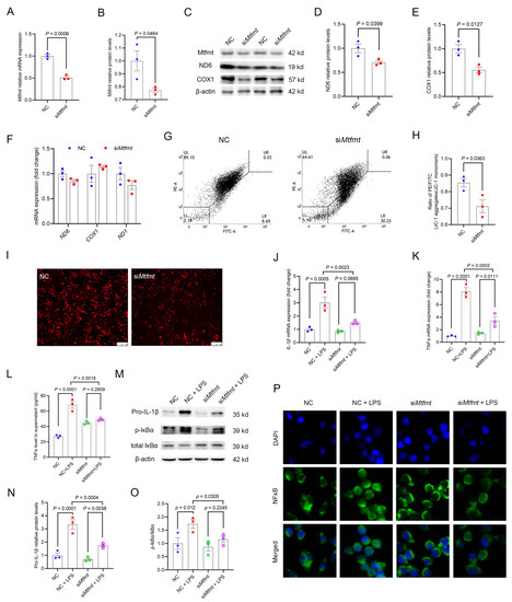 The Western blot analysis was carried out as per standard protocols on 10% SDS/PAGE gels and then transferred to nitrocellulose membranes. The membranes were blocked in TBST with 0.1% Tween-20 and 5% non-fat dry milk for 2 h and then incubated with primary antibodies against Mtfmt (1:1000, cat. no.: PAH614Mu01, Cloud-Clone Corp, Houston, TX USA), p-IkBα (1:1000, cat. no.: 2859S, Cell Signaling, Danvers, MA, USA), IkBα (1:1000, cat. no.: 9242, Cell Signaling, Danvers, MA, USA), IL-1β (1:1000, cat. no.: ab254360, abcam, Cambridge, UK), SDHA (1:1000, cat. no.: 14865-1-AP, proteintech, Rosemont, IL, USA), VDAC (1:1000, cat. no.: 10866-1-AP, proteintech, Rosemont, IL, USA), ND6 (1:1000, cat. no.: BS1632, Bioworld, Nanjing, China), COX1 (1:1000, cat. no.: BS70809, Bioworld, Nanjing, China), β-actin (1:20,000, cat. no.: AC026, Abclonal, Wuhan, China), and GAPDH (1:1000, cat. no.: MB001H, Bioworld, Nanjing, China).