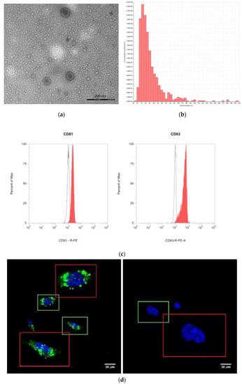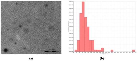 HUVEC-sEVs were isolated as previously described [20]. The TEM image and tunable resistive pulse sensing analysis showed the distinctive features of sEVs: bilayer cup-shaped membrane structure as a result of dehydration during sample preparation (Figure 5a), and particle size dimension roughly of 70–130 nm (Figure 5b).