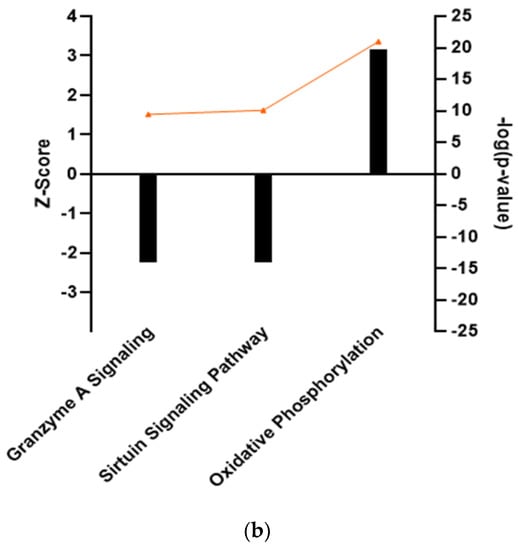 All the datasets from RNA sequencing and miRNA sequencing were analyzed with the Qiagen Ingenuity Pathway Analysis (IPA) software. For the RNA sequencing analysis, IPA categorized all DEGs in canonical pathways. IPA can make a prediction on possible diseases and functions, which were ranked based on their significance (p-value) and predicted state of activation/inhibition (z-Score). The Z-score value was set with cut-off < −2 or >+2. RNA sequencing was used to perform functional, biological pathway, biological process, and cellular component enrichment with the FunRich software [45], while MiRNet was used to analyze functional enrichment for miRNA sequencing. miRNet provided miRNA target gene data that were collected from four well-annotated miRTareBase v8.0 databases. Functional enrichment with miRNet was performed on the Reactome Biological Pathway database [46]. All miRNet enrichment was reported with a Prism 8.03 software graphical view (GraphPad Software Inc., Boston, MA, USA).