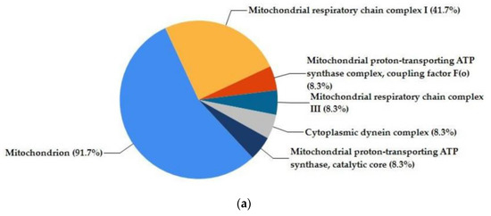 Functional enrichment analysis with FunRich software version 3. (a) Pie chart of cellular component enrichment. (b) Biological pathway enrichment. (c) Biological process enrichment. Percentage of genes involved in each function (blue bar), p-value (red bar), and reference (orange bar).