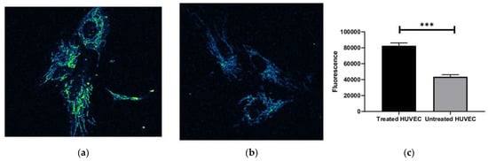 Mitochondrial membrane potential of HUVECs treated with DFO-sEVs compared to untreated cells. Representative images of (a) treated and (b) untreated HUVECs. (c) Fluorescence intensity quantification with ImageJ software vs8. *** p-value < 0.001.