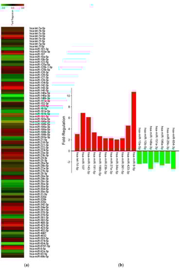 sEV-miRNA sequencing of HUVECs treated with DFO-sEVs. (a) Fold regulation of 89 identified miRNAs (upregulation cut-off > 2; downregulation cut-off < −2). (b) Histogram with 11 upregulated and 7 downregulated miRNAs.