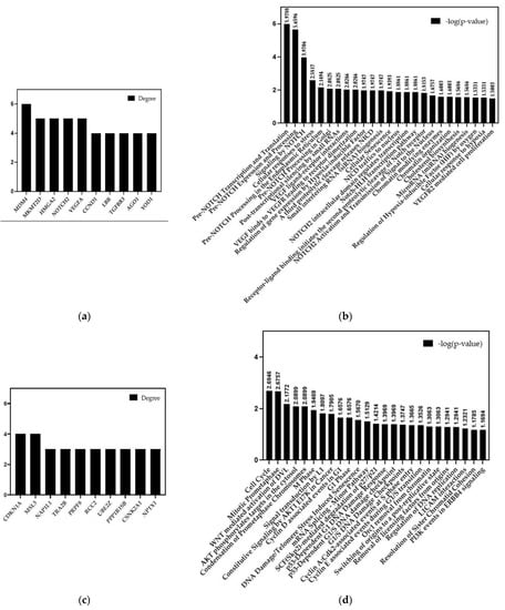 Illumina sequencing and IPA analysis were performed on sEV-miRNAs of treated HUVECs. Among the identified 89 miRNAs (Figure 6a), 18 miRNAs showed a significant fold-regulation value (upregulation cut-off > 2; down regulation cut-off < −2) (Figure 6b). Precisely, 11 miRNAs resulted in upregulation, while 7 resulted in downregulation. The functional enrichment analysis of upregulated and downregulated miRNAs was performed using the miRNet software Vs2 and Reactome biological pathway database (Figure 7). Figure 7a shows the 10 main target genes of the 11 upregulated miRNAs, such as MDM4, NOTCH2, VEGFA, CCND1, and TGFBR3. These target genes encoding proteins and receptors are related to several biological pathways of NOTCH, VEGFR, and HIF (Figure 7b). The ten main target genes of the seven downregulated miRNAs (Figure 7c) were related to cell proliferation and cell cycle progression (Figure 7d).