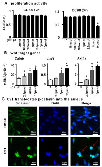 2.1. C91 Activates the Wnt/β-Catenin Signaling Pathway in the Osteoblast Cell Line MLO-Y4