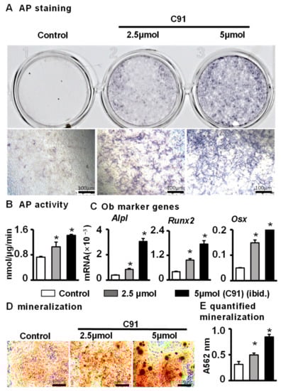 2.2. C91-Induced Osteocytes Promote Osteoblast Differentiation and Mineralization of ST2 Cells via Activation of Wnt Signaling