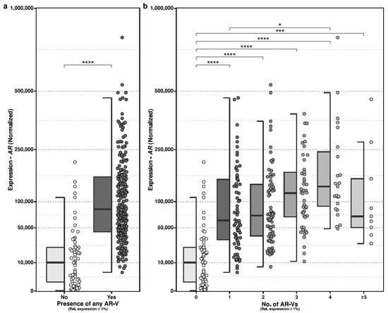 We evaluated whether harboring expression (≥1%) of any AR-Vs was associated with more abundant expression of AR, in general. We observed statistically significant differences in which samples that harbored an AR-V indeed displayed more abundant expression of AR (Figure 2a; two-sided Mann–Whitney test; p < 0.001).