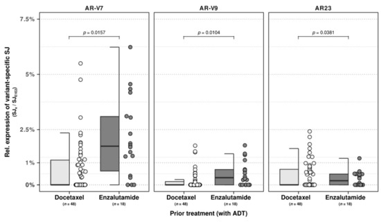 - Sieuwerts, A.M.; Onstenk, W.; Kraan, J.; Beaufort, C.M.; Van, M.; De Laere, B.; Dirix, L.Y.; Hamberg, P.; Beeker, A.; Meulenbeld, H.J.; et al. AR splice variants in circulating tumor cells of patients with castration-resistant prostate cancer: Relation with outcome to cabazitaxel. Mol. Oncol. 2019, 13, 1795–1807. [Google Scholar] [CrossRef] [PubMed]