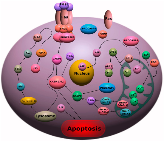 Apoptosis can be modulated by a number of proteins released from mitochondria into the cytoplasm: Smac (second mitochondria-derived activator of caspase)/DIABLO (direct IAP Binding protein with Lowp I) [19], HtrA2/Omi [20], and others. They bind apoptosis suppressors, proteins of the IAP family (inhibitor of apoptosis protein), which, in turn, are capable of inhibiting caspases-3, -7, and -9 [21]. AIF (apoptosis inducing factor) can induce caspase-independent apoptosis, causing chromatin condensation and DNA cleavage [22]. One of the key proteins of the mitochondrial pathway of apoptosis is the p53 protein, which can lead to the expression of many proapoptotic proteins, for example, PUMA (Figure 1) [23].