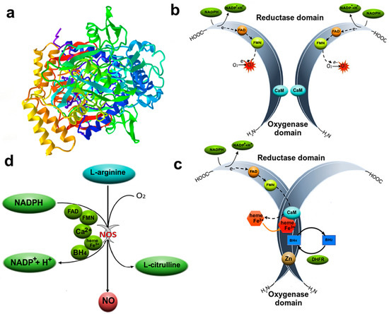 NO synthase structure and biocatalysis. (a) 3D-model of the structural organization of nNOS. (b) Monomeric organization of NOS: In NOS monomers, electron transfer can occur from reduced NADPH to FAD and FMH, resulting in the reduction of molecular oxygen to superoxide (O2−). Monomers and isolated reductase domains can bind to calmodulin (CaM). NOS monomers cannot bind to the cofactor tetrahydrobiopterin (BH4) or the substrate L-arginine, making NO generation impossible. (c) A functional dimer can form in the presence of heme. Heme is required for cross-domain electron transfer from flavins to heme of the opposite monomer. (d) NO biosynthesis by constitutive Ca2+-dependent NOS.