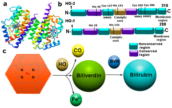 Structural organization of the enzymes responsible for the formation of CO and CO biosynthesis. (a) 3D-model of the structural organization of the HO-2 dimer; (b) primary structure of HO-1 and HO-2: C-terminal domain required for binding to the cytoplasmic membrane, catalytic domain, and N-terminal cytoplasmic domain. HO-2, unlike HO-1, carries an additional 30 amino acid residues at the N-terminus, as well as two Cys-Pro dipeptides near the C-terminus heme regulatory motifs (HRM); (c) schematic pathway of CO biosynthesis: HO catalyzes heme oxidation to form biliverdin CO and Fe2+. Biliverdin is converted to bilirubin by the enzyme Biliverdin reductase (BVR).